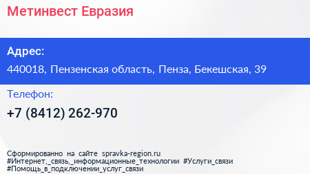 Метинвест Евразия по адресу 440018, Пензенская область, Пенза, Бекешская, 39 в дальнейшем Организация, размещена в следующих категориях:
