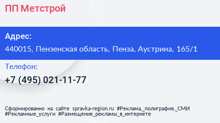 ПП Метстрой по адресу 440015, Пензенская область, Пенза, Аустрина, 165/1 в дальнейшем Организация, размещена в следующих категориях: