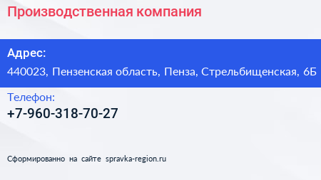 Производственная компания по адресу 440023, Пензенская область, Пенза, Стрельбищенская, 6Б в дальнейшем Организация, размещена в следующих категориях: