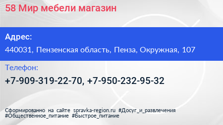 58 Мир мебели, магазин по адресу 440031, Пензенская область, Пенза, Окружная, 107 в дальнейшем Организация, размещена в следующих категориях: