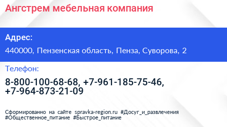 Ангстрем, мебельная компания по адресу 440000, Пензенская область, Пенза, Суворова, 2 в дальнейшем Организация, размещена в следующих категориях: