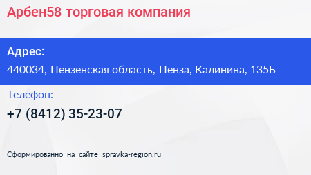 Арбен58, торговая компания по адресу 440034, Пензенская область, Пенза, Калинина, 135Б в дальнейшем Организация, размещена в следующих категориях: