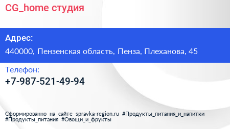 CG_home, студия по адресу 440000, Пензенская область, Пенза, Плеханова, 45 в дальнейшем Организация, размещена в следующих категориях: