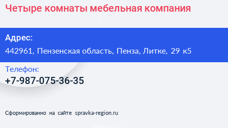Четыре комнаты, мебельная компания по адресу 442961, Пензенская область, Пенза, Литке, 29 к5 в дальнейшем Организация, размещена в следующих категориях: