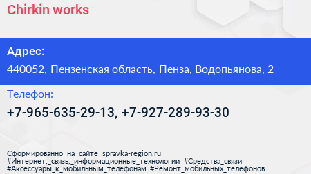 Chirkin works по адресу 440052, Пензенская область, Пенза, Водопьянова, 2 в дальнейшем Организация, размещена в следующих категориях: