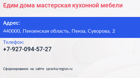Едим дома!, мастерская кухонной мебели по адресу 440000, Пензенская область, Пенза, Суворова, 2 в дальнейшем Организация, размещена в следующих категориях: