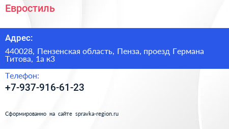Евростиль по адресу 440028, Пензенская область, Пенза, проезд Германа Титова, 1а к3 в дальнейшем Организация, размещена в следующих категориях:
