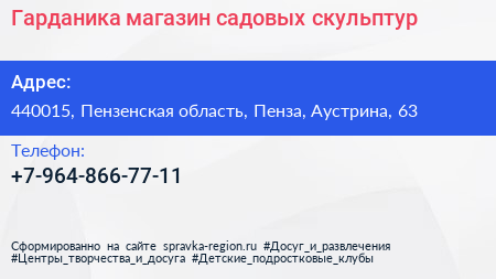 Гарданика, магазин садовых скульптур по адресу 440015, Пензенская область, Пенза, Аустрина, 63 в дальнейшем Организация, размещена в следующих категориях: