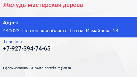 Желудь, мастерская дерева по адресу 440023, Пензенская область, Пенза, Измайлова, 24 в дальнейшем Организация, размещена в следующих категориях: