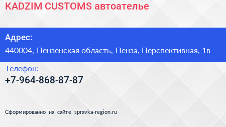 KADZIM CUSTOMS, автоателье по адресу 440004, Пензенская область, Пенза, Перспективная, 1в в дальнейшем Организация, размещена в следующих категориях: