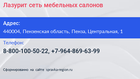 Лазурит, сеть мебельных салонов по адресу 440004, Пензенская область, Пенза, Центральная, 1 в дальнейшем Организация, размещена в следующих категориях: