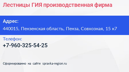 Лестницы ГИЯ, производственная фирма по адресу 440015, Пензенская область, Пенза, Совхозная, 15 к7 в дальнейшем Организация, размещена в следующих категориях: