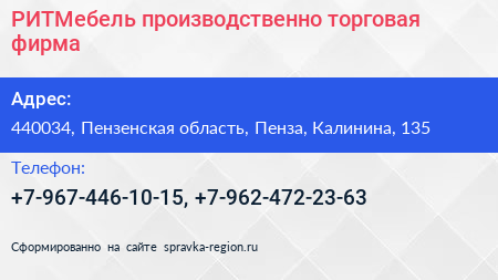 РИТМебель, производственно-торговая фирма по адресу 440034, Пензенская область, Пенза, Калинина, 135 в дальнейшем Организация, размещена в следующих категориях:
