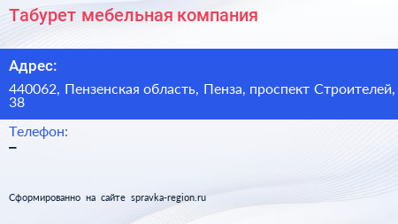 Табурет, мебельная компания по адресу 440062, Пензенская область, Пенза, проспект Строителей, 38 в дальнейшем Организация, размещена в следующих категориях: