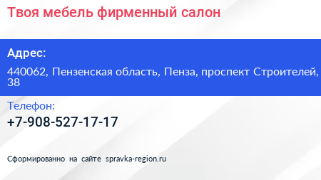 Твоя мебель, фирменный салон по адресу 440062, Пензенская область, Пенза, проспект Строителей, 38 в дальнейшем Организация, размещена в следующих категориях: