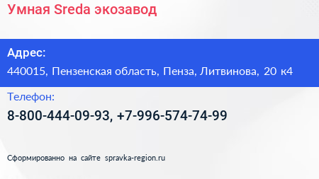 Умная Sreda, экозавод по адресу 440015, Пензенская область, Пенза, Литвинова, 20 к4 в дальнейшем Организация, размещена в следующих категориях: