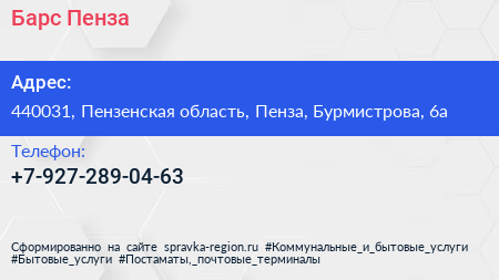 Барс-Пенза по адресу 440031, Пензенская область, Пенза, Бурмистрова, 6а в дальнейшем Организация, размещена в следующих категориях: