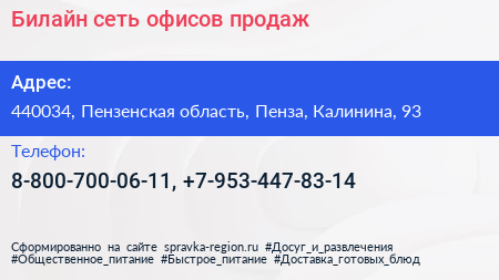 Билайн, сеть офисов продаж по адресу 440034, Пензенская область, Пенза, Калинина, 93 в дальнейшем Организация, размещена в следующих категориях: