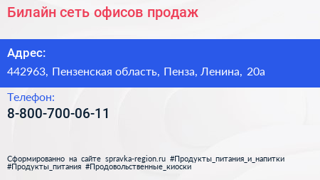 Билайн, сеть офисов продаж по адресу 442963, Пензенская область, Пенза, Ленина, 20а в дальнейшем Организация, размещена в следующих категориях: