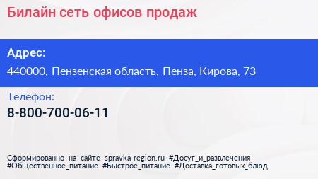 Билайн, сеть офисов продаж по адресу 440000, Пензенская область, Пенза, Кирова, 73 в дальнейшем Организация, размещена в следующих категориях: