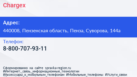 Chargex по адресу 440008, Пензенская область, Пенза, Суворова, 144а в дальнейшем Организация, размещена в следующих категориях: