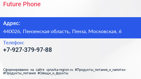 Future Phone по адресу 440026, Пензенская область, Пенза, Московская, 6 в дальнейшем Организация, размещена в следующих категориях: