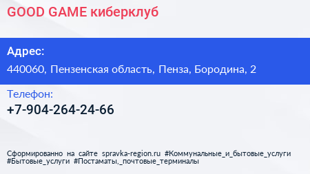 GOOD GAME, киберклуб по адресу 440060, Пензенская область, Пенза, Бородина, 2 в дальнейшем Организация, размещена в следующих категориях: