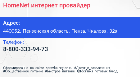 HomeNet, интернет-провайдер по адресу 440052, Пензенская область, Пенза, Чкалова, 32а в дальнейшем Организация, размещена в следующих категориях: