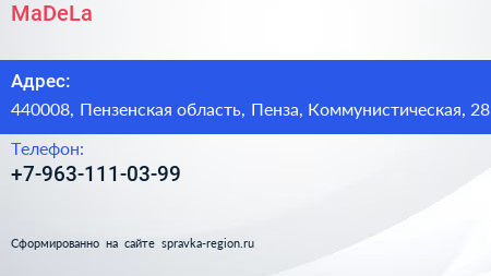 MaDeLa по адресу 440008, Пензенская область, Пенза, Коммунистическая, 28 в дальнейшем Организация, размещена в следующих категориях: