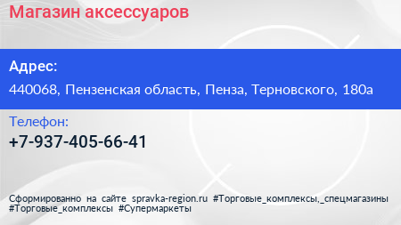 Магазин аксессуаров по адресу 440068, Пензенская область, Пенза, Терновского, 180а в дальнейшем Организация, размещена в следующих категориях:
