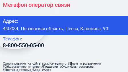 Мегафон, оператор связи по адресу 440034, Пензенская область, Пенза, Калинина, 93 в дальнейшем Организация, размещена в следующих категориях: