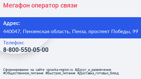 Мегафон, оператор связи по адресу 440047, Пензенская область, Пенза, проспект Победы, 99 в дальнейшем Организация, размещена в следующих категориях: