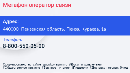 Мегафон, оператор связи по адресу 440000, Пензенская область, Пенза, Кураева, 1а в дальнейшем Организация, размещена в следующих категориях: