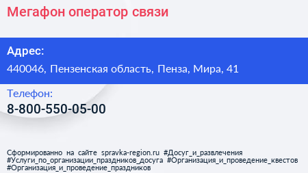 Мегафон, оператор связи по адресу 440046, Пензенская область, Пенза, Мира, 41 в дальнейшем Организация, размещена в следующих категориях: