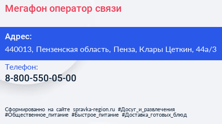 Мегафон, оператор связи по адресу 440013, Пензенская область, Пенза, Клары Цеткин, 44а/3 в дальнейшем Организация, размещена в следующих категориях: