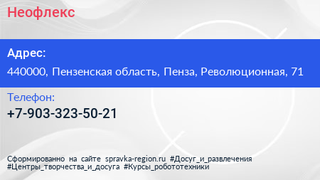 Неофлекс по адресу 440000, Пензенская область, Пенза, Революционная, 71 в дальнейшем Организация, размещена в следующих категориях: