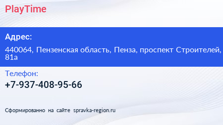 PlayTime по адресу 440064, Пензенская область, Пенза, проспект Строителей, 81а в дальнейшем Организация, размещена в следующих категориях: