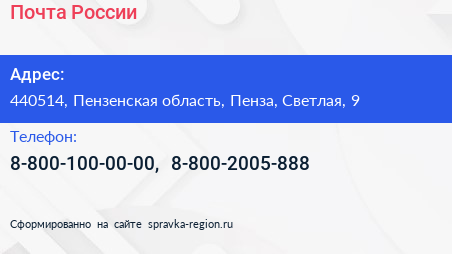 Почта России по адресу 440514, Пензенская область, Пенза, Светлая, 9 в дальнейшем Организация, размещена в следующих категориях: