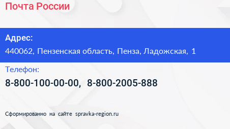 Почта России по адресу 440062, Пензенская область, Пенза, Ладожская, 1 в дальнейшем Организация, размещена в следующих категориях:
