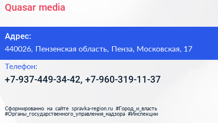 Quasar media по адресу 440026, Пензенская область, Пенза, Московская, 17 в дальнейшем Организация, размещена в следующих категориях:
