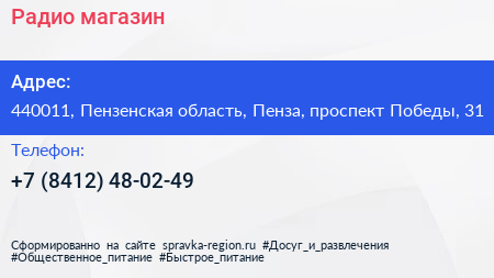 Радио, магазин по адресу 440011, Пензенская область, Пенза, проспект Победы, 31 в дальнейшем Организация, размещена в следующих категориях:
