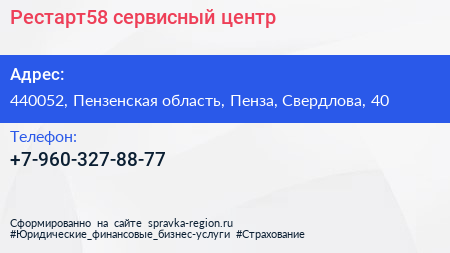 Рестарт58, сервисный центр по адресу 440052, Пензенская область, Пенза, Свердлова, 40 в дальнейшем Организация, размещена в следующих категориях: