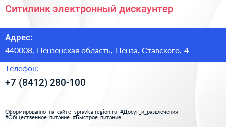 Ситилинк, электронный дискаунтер по адресу 440008, Пензенская область, Пенза, Ставского, 4 в дальнейшем Организация, размещена в следующих категориях: