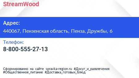 StreamWood по адресу 440067, Пензенская область, Пенза, Дружбы, 6 в дальнейшем Организация, размещена в следующих категориях: