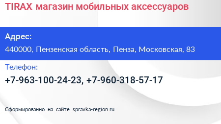 TIRAX, магазин мобильных аксессуаров по адресу 440000, Пензенская область, Пенза, Московская, 83 в дальнейшем Организация, размещена в следующих категориях:
