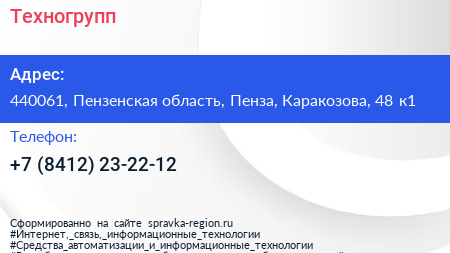 Техногрупп по адресу 440061, Пензенская область, Пенза, Каракозова, 48 к1 в дальнейшем Организация, размещена в следующих категориях: