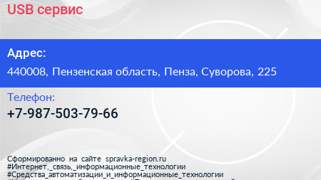 USB сервис по адресу 440008, Пензенская область, Пенза, Суворова, 225 в дальнейшем Организация, размещена в следующих категориях: