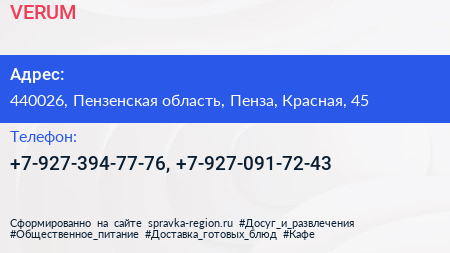 VERUM по адресу 440026, Пензенская область, Пенза, Красная, 45 в дальнейшем Организация, размещена в следующих категориях: