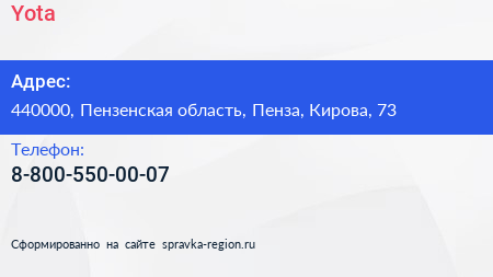 Yota по адресу 440000, Пензенская область, Пенза, Кирова, 73 в дальнейшем Организация, размещена в следующих категориях: