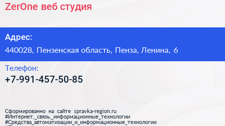 ZerOne, веб-студия по адресу 440028, Пензенская область, Пенза, Ленина, 6 в дальнейшем Организация, размещена в следующих категориях: